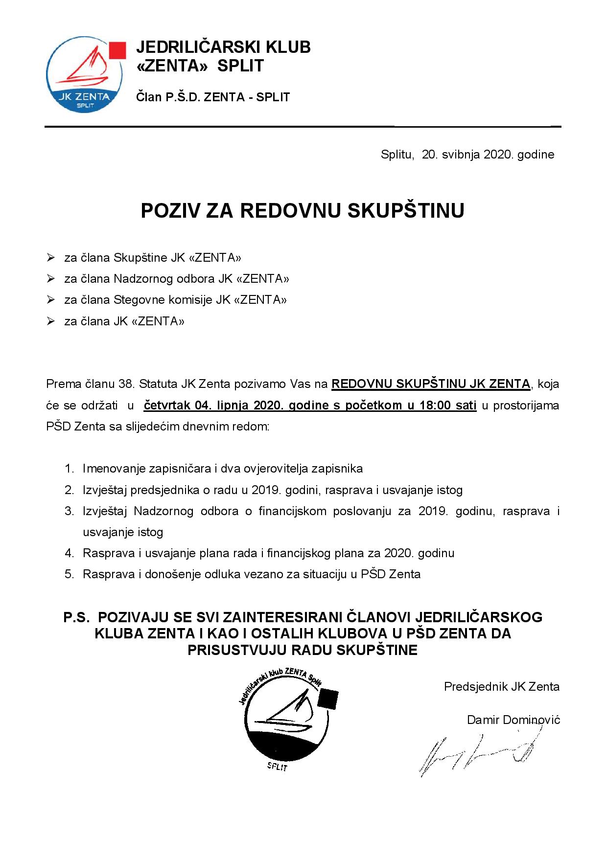 Redovna Skupština JK Zenta održana je u ponedjeljak 21. veljače 2019. godine s početkom u 18 sati u prostorijama PŠD Zenta.